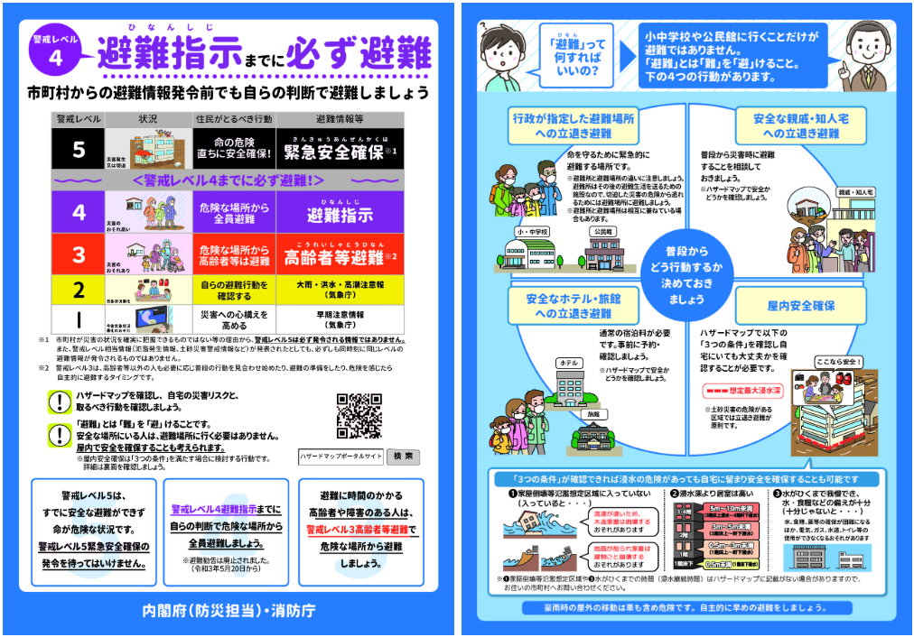 常陸大宮市は、避難が必要な状況であると判断した場合、その緊急度に応じた避難情報を発表します。避難情報が発表されていない場合においても、危険性があると判断されるような場合には、早めの自主避難をおこなってください。(図をクリックすると、拡大して表示できます。)